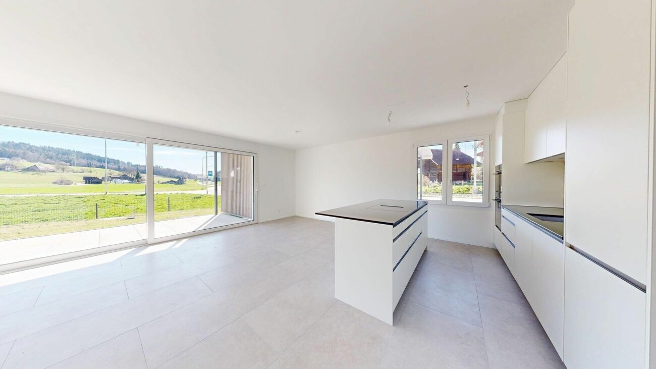 Wohnbereich: Der offene Wohn- und Essbereich begeistert durch seine grosszügige Raumwirkung und die grossen Fensterfront, welche den Innenraum mit Licht durchflutet und einen harmonischen Übergang zum Garten schafft. Im Wohn- und Küchenbereich sorgen hochwertige Steinplatten für eine elegante, pflegeleichte Oberfläche, während in den Schlafzimmern edle Parkettböden eine warme Wohnatmosphäre schaffen.